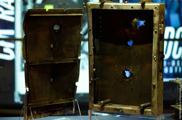Слева — алюминиевый «панцирь» толщиной 102 мм, защищающий сверхкритичные блоки международной станции, в который попал кусочек пластика на скорости 6795 м/с. Справа — 38-мм алюминиевая защита, в которую, по касательной, попал болт 6×12 мм на скорости 6410 м/с.