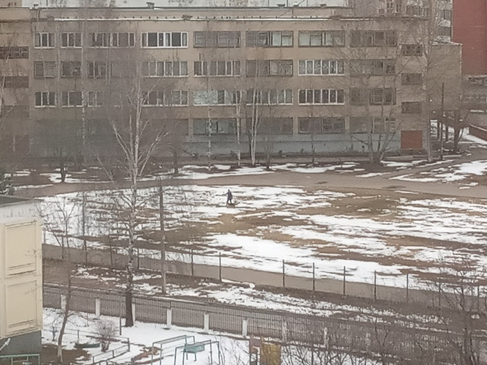 1 апреля - на улице +1, слякоть. В поле зрения один мужик с собакой.