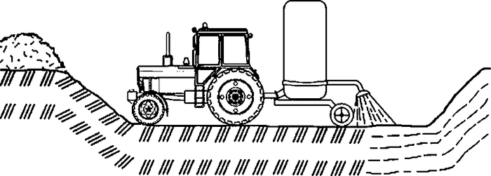 Рисунок А.4 — Операция увлажнения верхнего слоя грунта сооружения, предназначенного для срочного захоронения трупов, усиленного модификатором свойств грунтов и минеральным вяжущим с помощью поливальной машины