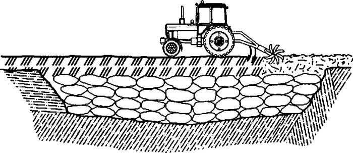Рисунок А.6 — Операция удаления органических остатков и перемешивания вместе с модификатором свойств грунтов и минеральным вяжущим верхнего слоя грунта обваловки сооружения, предназначенного для срочного захоронения трупов