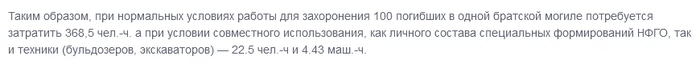 Так, в упомянутой "методичке" есть пункт про "Срочное захоронение трупов в военное время" (2012 год, напомню). Сам этот пункт, свою очередь, ссылается на ПП "Об утверждении Положения о гражданской обороне" еще от 26 ноября 2007 г. N 804. Где сказано, что основные мероприятия ГО в случае с трупами это