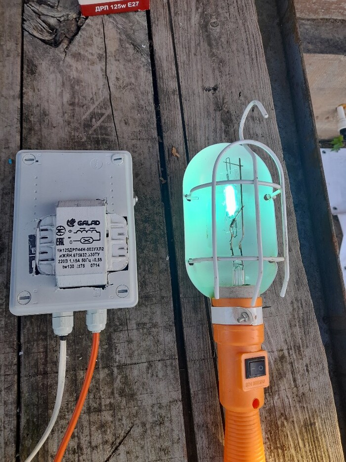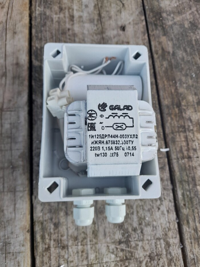 Итак приобретён дроссель под лампу дрл-125 (370р.), конденсатор для подобных ламп 10 мкФ на 350В (180р., не обязателен, но лучше ставить) и лампа дрл 125 (350 р.). В своих закромах нашёл корпус и переноску.