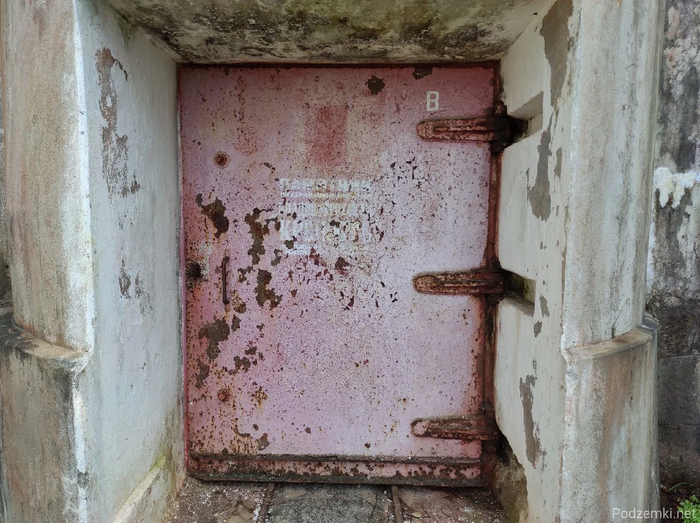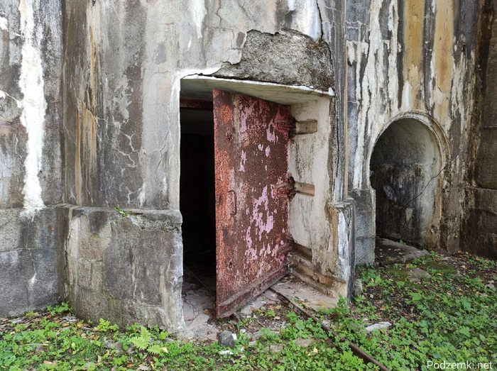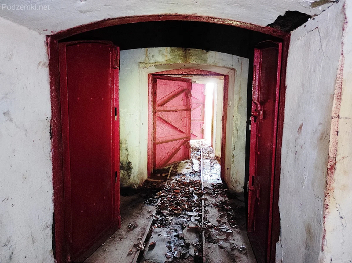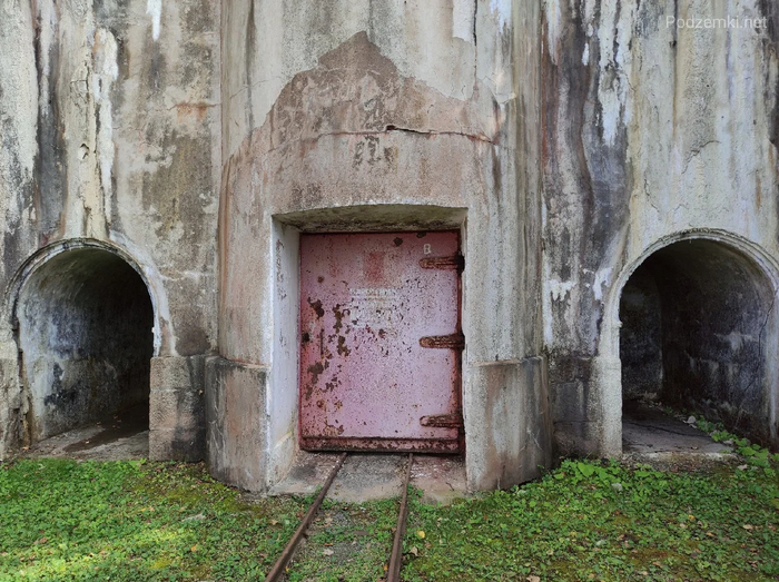 Помимо дверей, напротив хранилищ сохранились даже поворотные круги и узкоколейка, по которой тележки с "грузом" могли передвигаться вручную. Над порталом этого и остальных тоннелей видно воздухозаборник в виде башни. Также порталы всех хранилищ оборудованы сквозником для защиты тоннеля от ударной волны и осколков.