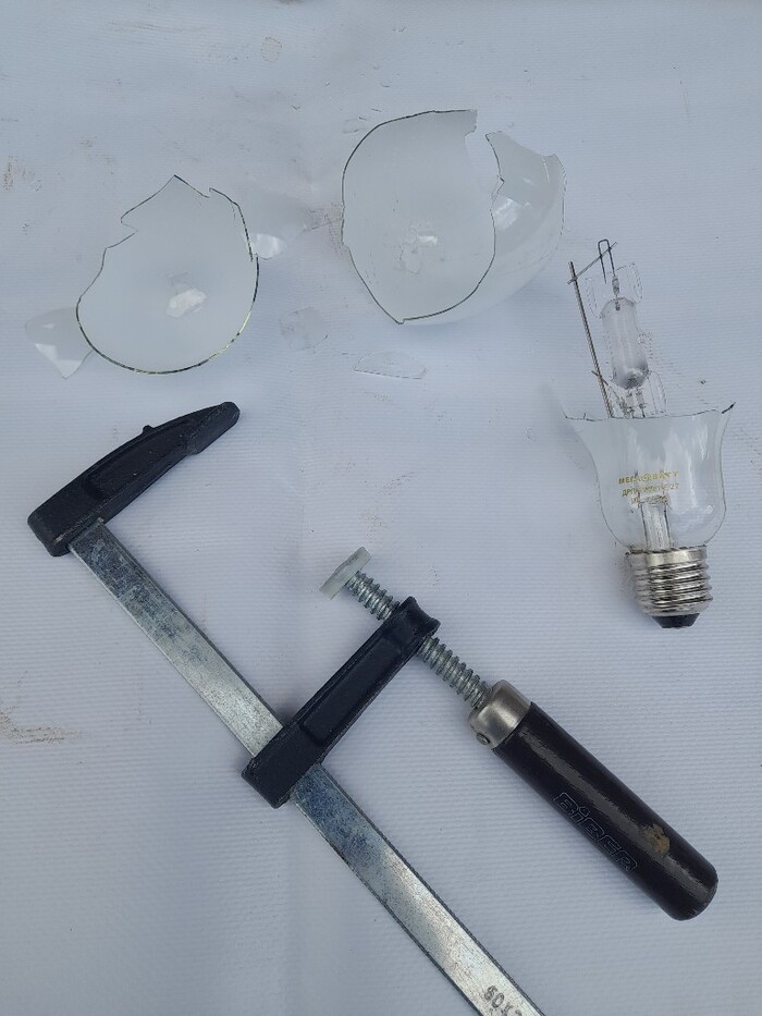 Ломаем остекление лампы с люминофором и убираем его кусочками до основания: