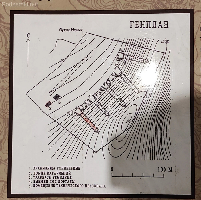 Эта "слоеная" конструкция хорошо видна на схеме в музейном тоннеле. Справа показан разрез тоннеля, а слева видно схематичное изображение "рыбьего хвоста" над порталом и вентиляционный ствол хранилища.
