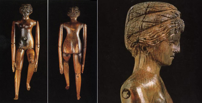 В собрании Британского музея хранятся куклы, найденные при раскопках в Египте. Первая — деревянная, изображающая женскую фигуру с волосами из бусин, изготовлена более 3500 лет назад. По мнению одних ученых, эти куклы помещались в могилы мужчин в качестве наложниц для оказания интимных услуг в загробном мире. Другие полагают, что это символ плодородия, который должен был обеспечить покойному перерождение. Подобные куклы археологи находили во многих захоронениях Фив, датируемых 2080–1990 годами до н. э.