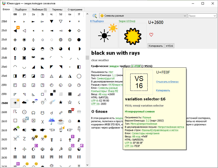 Зато Юникодия, раз уж это энциклопедия символов, таскает 110 мегабайт шрифтов, и с каждым новым Юникодом этих шрифтов становится больше и больше. Основной источник увеличения — китайские иероглифы: шрифту А я максимально доверяю, шрифт Б содержит новые символы, шрифт В — корейский и японский в каноничном для них формате «без засечек».