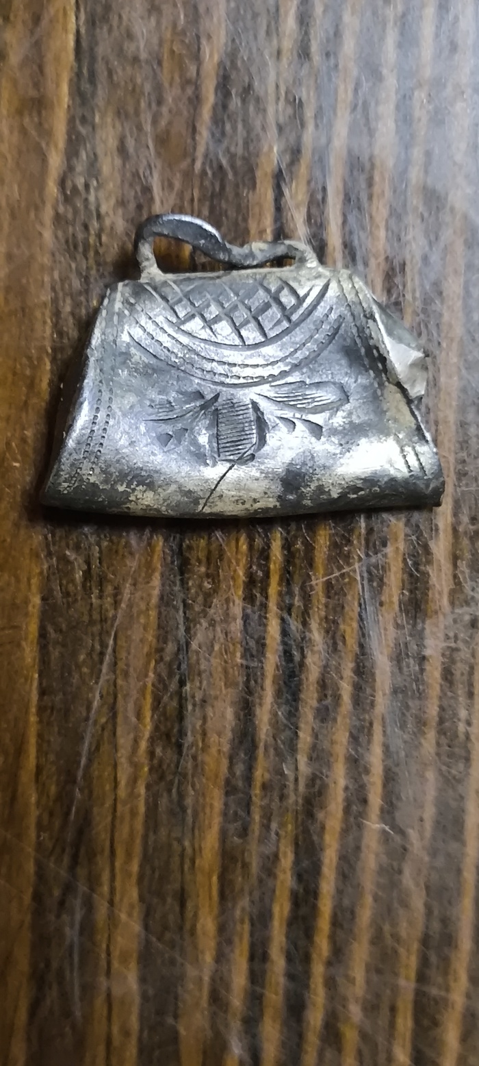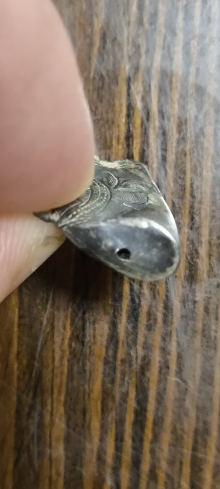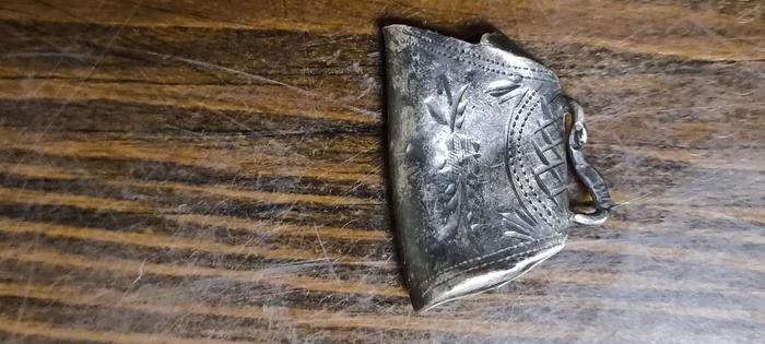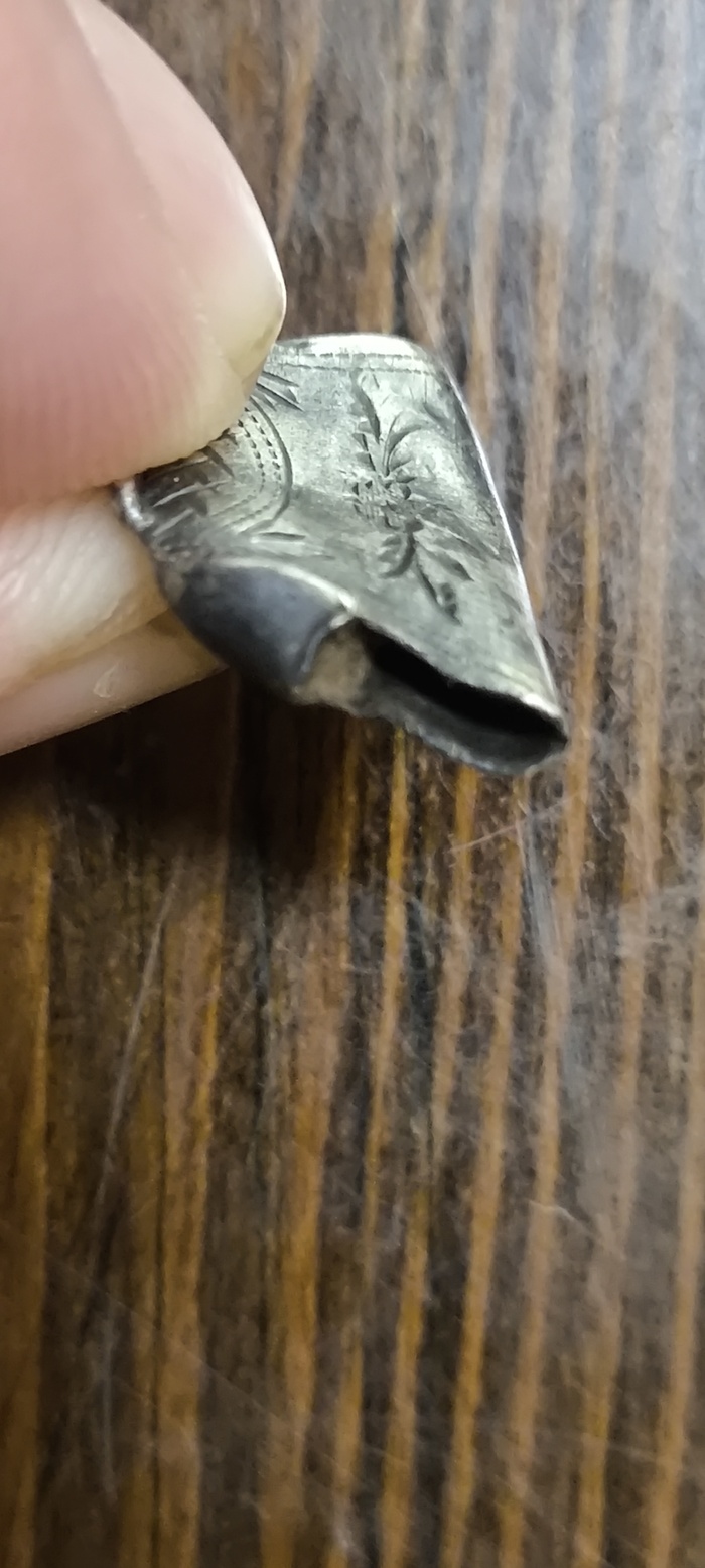 Серебро. Размер в длину полтора см. Качественная пайка по торцам. Рисунок тоже качественный. Но побита и изуродована плугом.