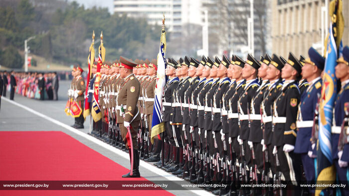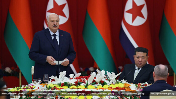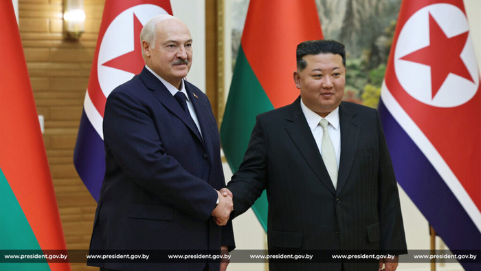 И даже родные композиции. На такой высокой ноте и в тёплой атмосфере белорусского лидера принимала Северная Корея. Это был официальный визит, но весь церемониал как во время самого высокого по дипломатическому рангу — государственного. И конный караул, как в Мьянме, и артиллерийские залпы, как в Омане, и театрализованное представление, как в Китае. Даже обнялись почти как с Путиным.