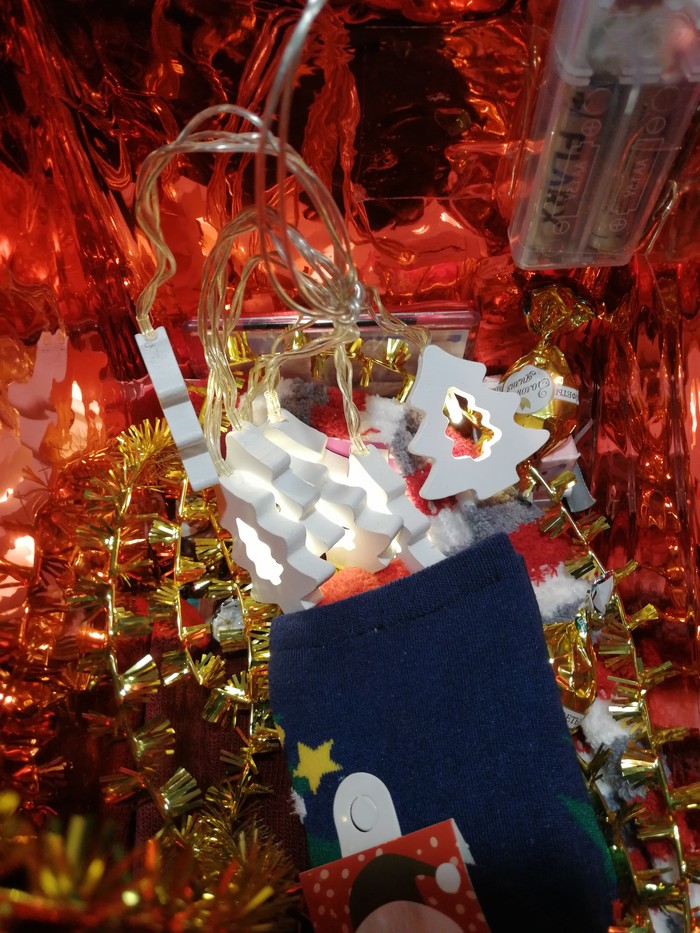 Внутри коробка обклеена глянцевой бумагой, к коробке приклеена гирлянда на батарейках, включаешь и такое чудо происходит! Так тепло сразу стало, ты моя умничка, снегурочка! Я видимо очень хорошо себя вела)