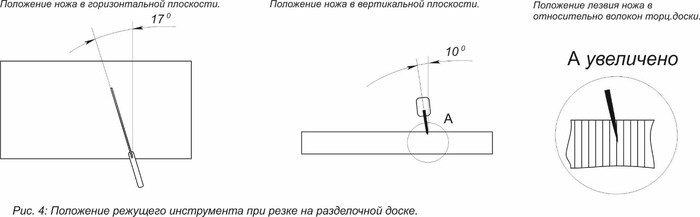На рис. 4 показано естественное положение ножа при резании продуктов на поверхности доски. Оно обусловлено строением кисти, положением хвата ножа и положением предплечья человека в момент выполнения данной работы. Человек, производя резку на доске перед собой, отводит локоть от туловища, а предплечье обращает от плеча под углом к переднему краю доски. По нашим «эмпирическим» вычислениям и по наблюдению за выполняющими данную работу, этот угол находится в пределах 17-20 градусов. То есть: предплечье и кисть с ножом, не под прямым углом совершают возвратно-поступательное движение по доске, а отклонены за счет локтя на упомянутый угол от перпендикуляра к боковой поверхности доски (обращенной к режущему). Кроме того, сам нож из-за особенностей хвата (нож удерживается в ладони с правой стороны, при работе правой рукой) естественным образом, обухом наклонён влево на определённый угол, а не строго перпендикулярен рабочей плоскости доски. Каждый может обратить на это внимание при резке продуктов на доске. Опять-же, в ходе проведённых опытов, этот угол составил 10-12 гр. А этот факт, уже не так уверенно позволяет заявлять, что волокна доски не надрезаются, а раздвигаются. Очень решительно надрезаются – упомянутая выше «реставрация» совсем не случайно была выпячена, в качестве неоспоримого преимущества в вопросе выбора доски в личное хозяйство. Мастера знают о чем говорят. А значит, некоторое количество древесных волокон срезанных, а не раздвинутых, всё-таки будет употреблено в пищу. Вместе с тем, доски обыкновенные, подвержены скалыванию и срезанию частиц с рабочей поверхности в большей степени. И в организм человека с пищей, несомненно, попадут те самые микрочастицы. Насколько опасно попадание таких микрочастиц в организм человека, причем, с обычных досок в несколько большем объёме, чем от торцевых – эмпирически выяснить не удалось. Но как сильно, может быть опасно внутри организма человека микроколичество микрочастиц природного материала, например, дуба? Разбираться в этом вопросе – задача фитотерапевтов, которые подобными микрочастицами, в куда больших количествах, лечат пациентов, причем, весьма и весьма успешно. А наш аргумент и, это будет аргумент любого здравомыслящего человека: «живое» – не может быть вредным, главное мера. А микроколичество микрочастиц указанного органического материала, попавшее в организм, ни в кой мере не способны навредить человеку. Да, обязательно, следует вспомнить коньячные дубовые бочки. Коньяк – этот древнейший напиток, «Дубовый Экстракт» - наделенный большим количеством терапевтических свойств, о которых говорилось, даже в «Бриллиантовой руке» - он почему таким стал? Правильно – от насыщения дубильными веществами из дубовой бочки. И ещё всякими другими ценными фитокомпонентами. И, простите, от диареи - кору дуба употребляют, кишечник стабилизируя, в том числе и у детей. Вот. Даже, эта аргументация, в рамках формальной логики и в приведённых микроколичествах, способна всё объяснить думающему человеку. Неправы опять, защитники торцевых шедевров. Сколы есть в любой доске и с любой доски, что-то, да попадает в организм. И вреда от этого, в оговоренных количествах – никакого. Не пластик – же. Каждый это понимает. Да, и в довершение, не устоим от соблазна вставить цитату от классика литературы и - вставим! Н