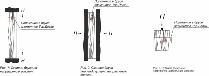 Правильно: Режущие и рубящие. И, по примеру с рубкой дров, такие нагрузки для доски являются разрушающими. Факт. «Но! Согласно первому утверждению, прочность поверхности в 2 раза выше!» - будет настаивать Мастер торцевых церемоний и у некоторых впечатлительных граждан, читающих в этот момент текст, может начать дергаться глаз. Не следует так волноваться. Уверены, что автор утверждения, хотел сказать, что древесина имеет различные свойства в разных направлениях, но почему-то промолчал. А мы молчать не станем! Это явление называется - анизотропия. В следствии чего, те или иные виды нагрузок, также и воспринимаются по-разному. И, если не рубить брёвна острыми предметами, а по всей плоскости торцев их равномерно сжимать, в направлении друг друга, то такую нагрузку (нагрузку на сжатие (см. Рис. 1,2)), бревно выдерживает замечательно. Причем, прочность на сжатие вдоль волокон окажется, даже не в 2 раза, а до 10 и более раз, большей, нежели, чем при сжатии того-же образца поперёк волокон. Всё зависит от породы дерева и высоты волокна в изделии. И чем волокно короче, тем большую нагрузку на сжатие способна выдержать торцевая доска. По части прочности на сжатие торцевая доска - идеальный вариант. Разгадали мы, о чем думал «Мастер Торца», но боялся прямо сообщить: Владелец торцедоски может уверенно сжимать приобретённое изделие по торцевым плоскостям, не боясь разрушения своего бытового шедевра. Но сжимать следует строго по всей плоскости торца. Несоблюдение приведет к расслаиванию вдоль волокна, либо раскалыванию.