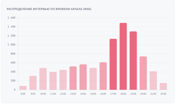 Пик - с 17:00 до 20:00 по Москве. Это логично: большинство кандидатов работают и собеседуются после рабочего дня. Второй, меньший пик - 10:00-12:00.