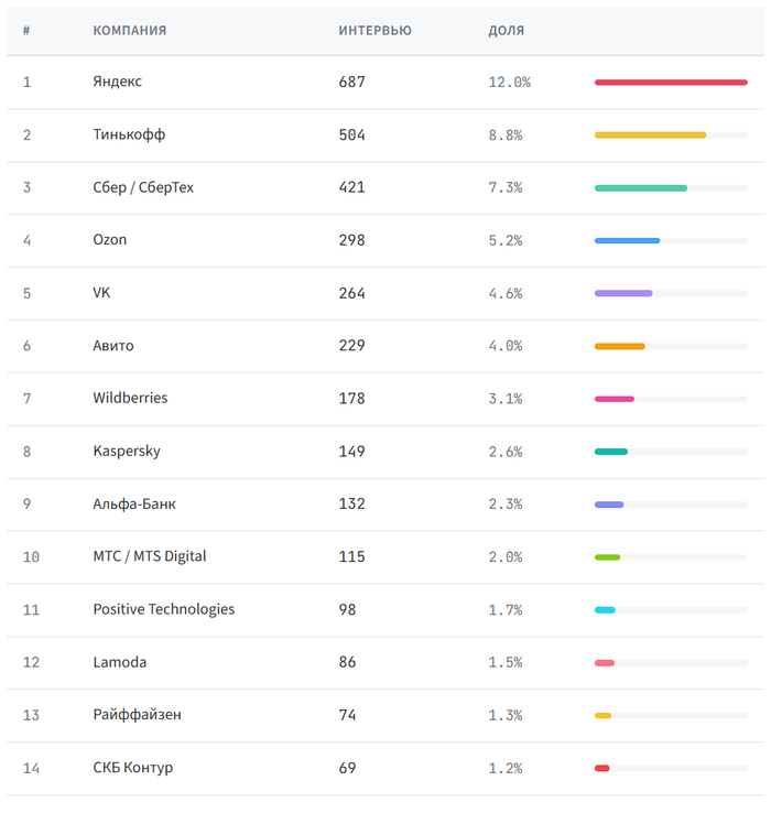 Яндекс на первом месте - 12%. Цифра большая, но не запредельная: кандидаты знают, что собеседование в Яндекс тяжёлое, и готовятся серьёзнее, отсюда перекос в сторону инструментов вроде Энигмы.