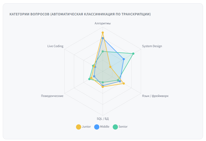Классификация вопросов - автоматическая, на основе ключевых слов в транскрипции. Точность ~81% по моей оценке. Уровень кандидата (джун, мидл, сеньор) - self-reported, пользователь указывает в настройках резюме. Данные по компаниям доступны только для 62% сессий.