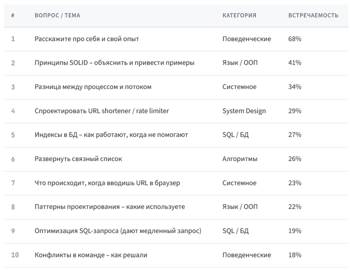 Я почти год собирал анонимизированную статистику с реальных технических интервью. Вот что получилось: кто собеседуется, куда, на какие позиции и какие вопросы задают чаще всего.