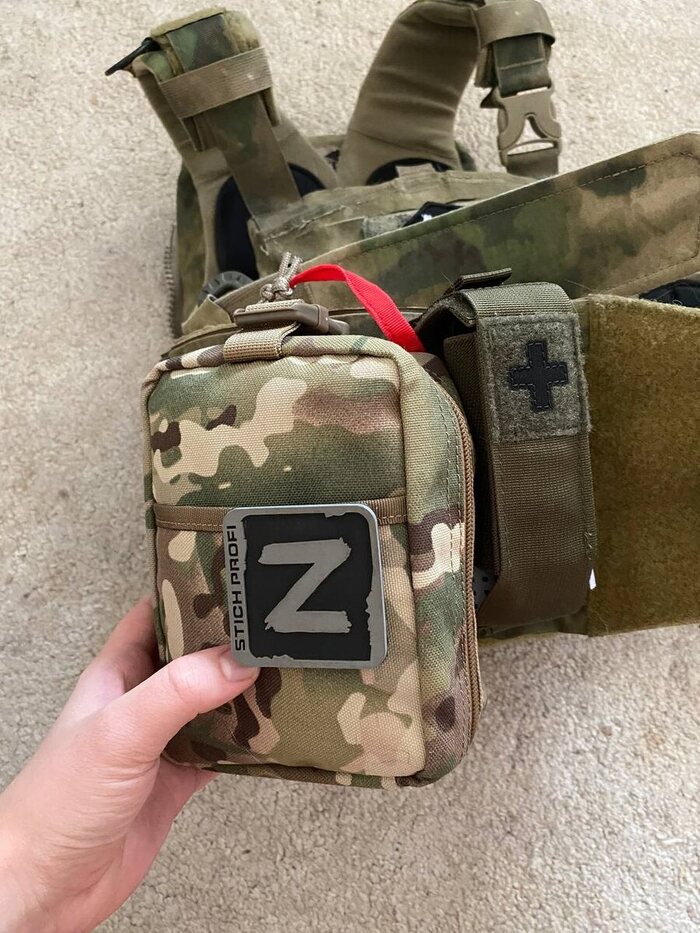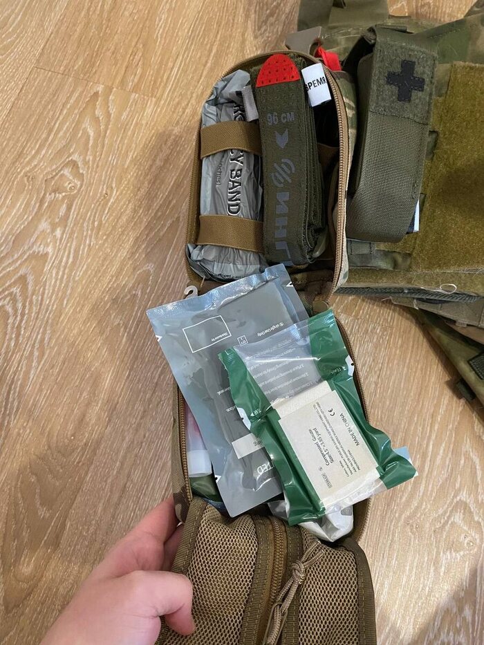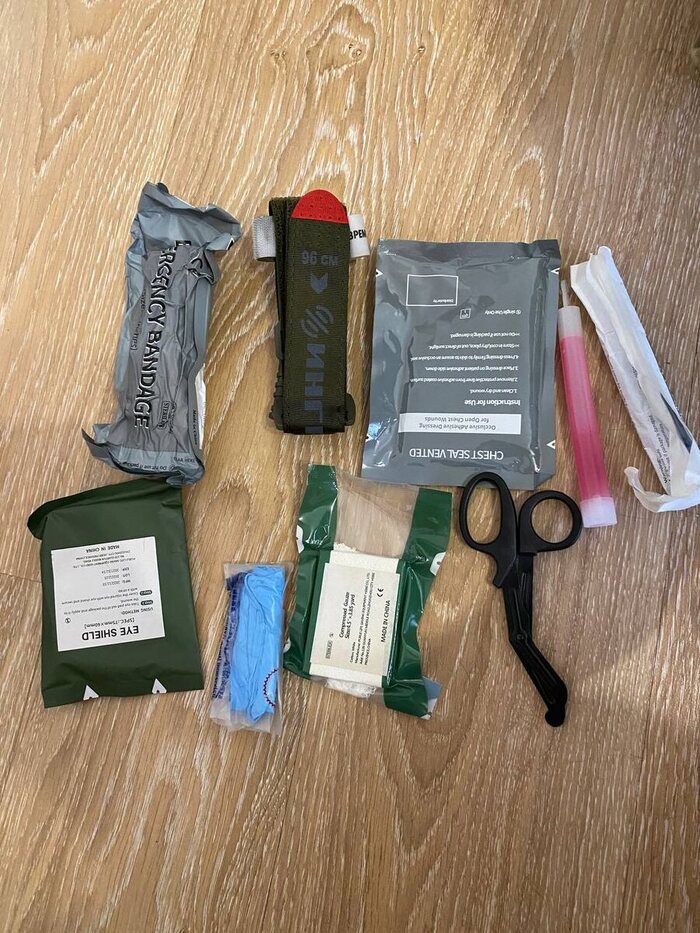 При вскрытии аптечки внутри есть отдельный турникет, z-образный бинт для тампонады, бандаж 6-дюймовый(в идеале, конечно брать 8-дюймовый, но что имеем),перчатки медицинские, ножницы, повязка на глаз, пластырь окклюзионный для решения проблемы, при ране грудной клетки,(Трахеальная трубка история не сильно обходимая, но у коллег из мет бата можно на нее что-то обменять).