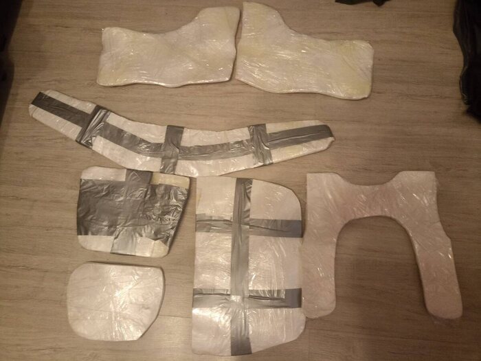 Берем его и начинаем потрошить по швам не задевая мягкую броню и извлеченные пакеты упаковываем в пищевую пленку и целлофан, проклеивая скотчем.