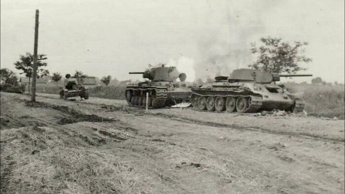 И, ударив в слабое место, группе бригадного комиссара Николая Кирилловича Попеля удается продвинуться. Группа состояла, к слову, из частей 34-й танковой дивизии, имевшей 150 танков на 26 июня, и ещё до 30 машин из состава 23-го и 24-го полков. Были в группе и КВ, и даже многобашенные исполины Т-35. Вообщем танкисты, прорвав оборону, выскакивают на шоссе Броды-Дубно - тыловую нить снабжения немецких авангардов у Острога, и двигаются, собственно говоря, к Дубно, у окраин которого танкисты были уже вечером. Город было решено брать утром, и зря. Ночью в Ровно заходит 111-я пд с артиллерией, включая зенитки 88мм, и закрепляется там. Не могу не отметить, что немцы использовали различные стимуляторы, позволявшие отказываться от сна. Нашим и чайка попить тогда было некогда, усталость никто не отменял. Как итог, попытка войти в город утром не имела успеха, несколько танков только выскакивают на западную окраину, где их подбивает немецкая артиллерия. В бою участвуют и исполины Т-35. Одна из машин на снимке ниже повреждена в борт, а вот на втором ещё КВ-2, подбитый зенитчиками, об этом и гласит надпись. Но удержание Ровно не было успехом для врага.