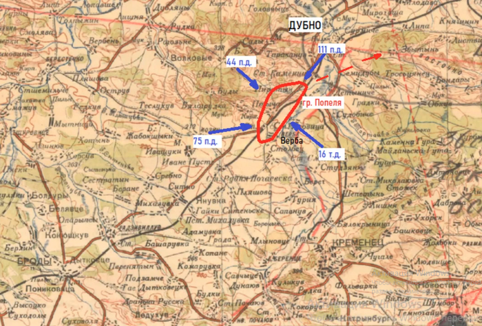 «На правом фланге 1-й танковой группы 8-й русский танковый корпус глубоко вклинился в наше расположение. Это вклинение противника, очевидно, вызвало большой беспорядок в нашем тылу в районе между Бродами и Дубно. Противник угрожает Дубно с юго-запада, что при учете больших запасов вооружения и имущества в Дубно крайне нежелательно»