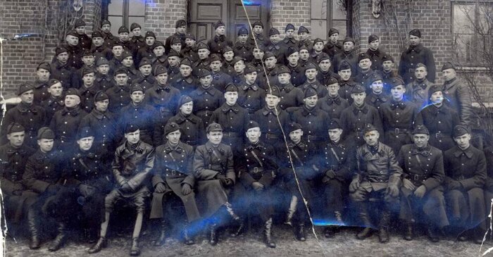 Литовские бойцы в старой форме. Но с советскими знаками различия. На офицерах фуражки национального образца.