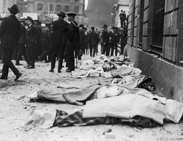 Градом металлических осколков мгновенно убило 30 человек и ранило около 300. Ещё восемь человек скончались от полученных травм в течение нескольких дней. Картина ужасная - неподалеку от банка, крупнейшего банка мира на тот момент, лежали обугленные тела и оторванные конечности. Даже сейчас следы того взрыва можно увидеть в районе дома 23 по Уолл-стрит, где стена до сих пор усеяна следами от осколков.