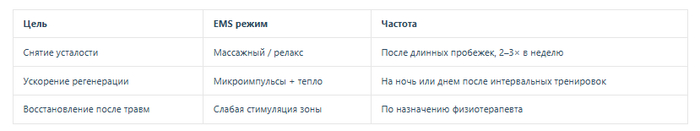 Как часто использовать EMS во время подготовки к марафону? Рекомендуется 2–3 EMS-сессии в неделю: одна — восстановительная, одна — силовая или функциональная. В дни отдыха EMS можно использовать вместо активной тренировки.