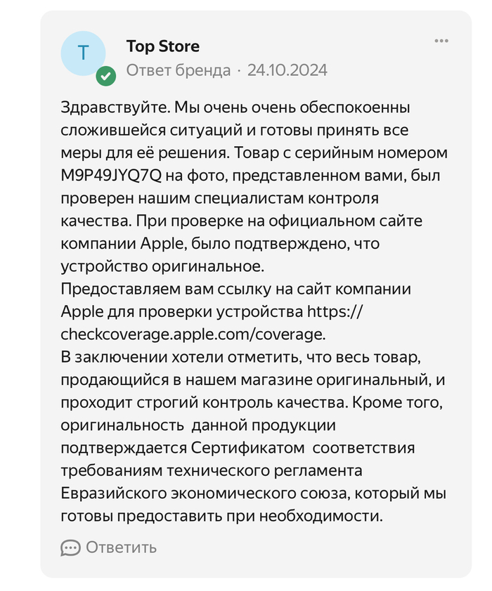 Также я написал негативный отзыв, где описал почему это подделка. Продавец заявил о своей «обеспокоенности», но намекнул, что если я проверю наушники через Apple Coverage, то это меня убедит в их оригинальности, также рассказал про какие-то сертификаты, очевидно, на свою поддельную продукцию.