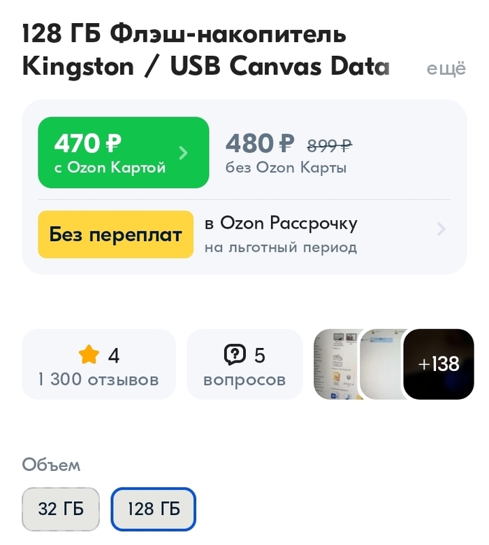 Купил на Озоне флешку 128 Гб за 638 рублей. Прочитал половину отзывов и подумал что флешка нормальная. При подключении к домашнему компьютеру она нормально определилась и я скопировал на флешку фильм. Пытался подключить к ТВ Samsung, но телевизор не увидел флешку. Подключил к компьютеру - компьютер не увидел флешку. Сделал в пункте выдачи Озона возврат - деньги сразу вернули.