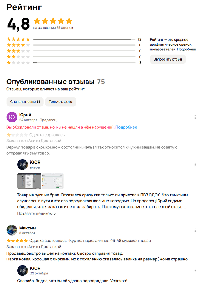 И еще на Авито у многих элитные аккаунты. Я вызвала электрика из компании. Он пришел пьяный. Я пыталась написать отзыв на компанию. Раз 20. Очень было обидно за потерянное время. И Авито каждый раз отвечало, что система борется с накрутками. И иногда хамски ответят в переписке и бравада, мол ,а ничего не сделаете, я за свой профиль 7 тыс заплатил! А ваш сейчас испорчу. Он ведь вам нужен! И отползаешь, глотая оскорбления, себе дороже. И ничего! Однажды даже не заметила, нашла у себя отзыв ,где меня прямо обзывают мошенницей. (Сдала в аренду помещение, а человек не заплатил за след. месяц, выставила. Вот написал.. Всего 86 отзывов. 4,8 рейтинг, нормально. А по правилам все, что старше 45 дней-не удалить уже. То есть преступление оскорблять человека без оснований имеет оправдательный срок давности.) Конституция у нас высший суд, все имеют право на уважение. А у Авито спустя 45 дней мы это право теряем...