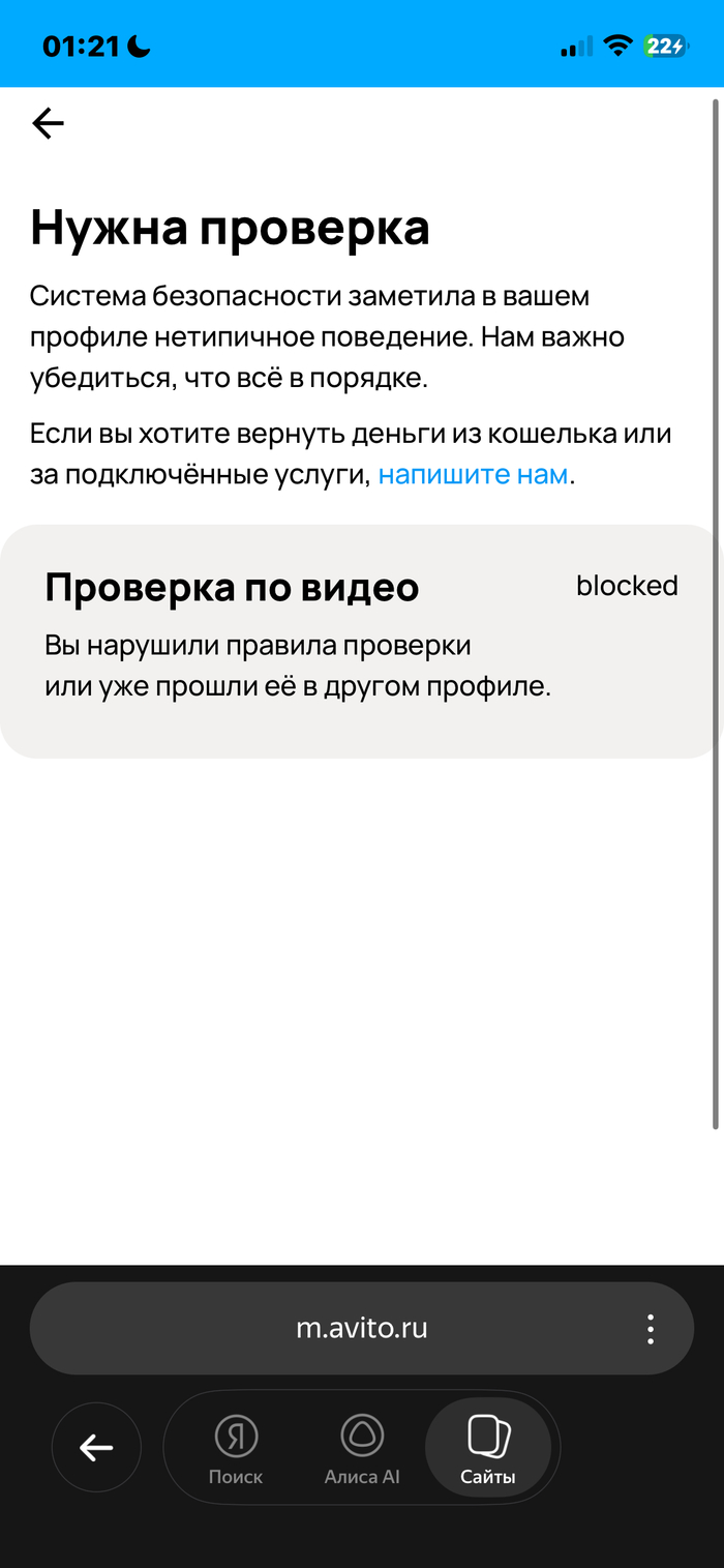 @Avito.help Avito заблокировало аккаунт, указав причину «некоторые действия в вашем профиле могли вводить других пользователей в заблуждение». Так могли или нет, Вы там определились? На мою просьбу озвучить конкретную причину, получил в ответ очередную туфту в духе «мы не можем раскрывать все технические детали проверки». Да мне глубоко по... на ваши «методы». Я попросил назвать совершенное мною деяние.