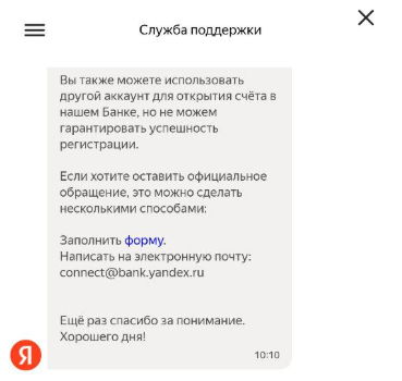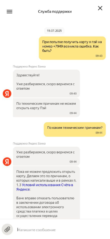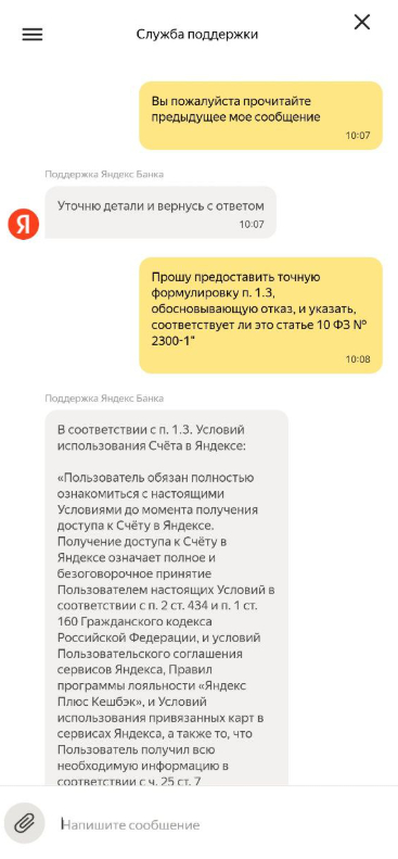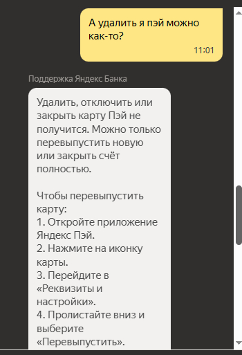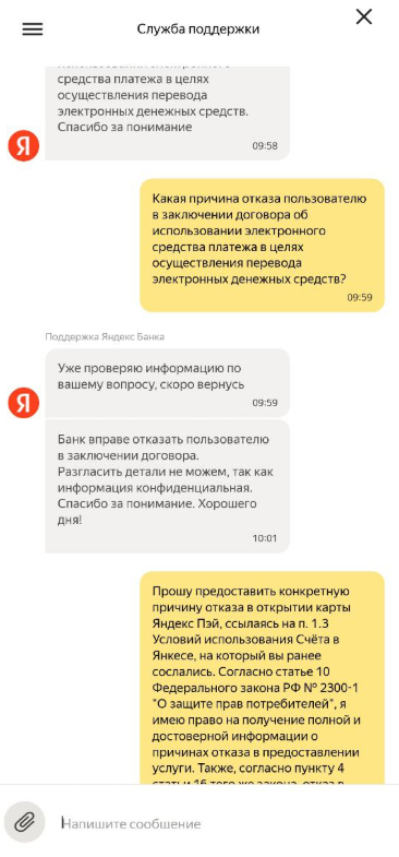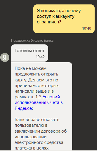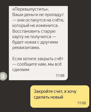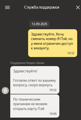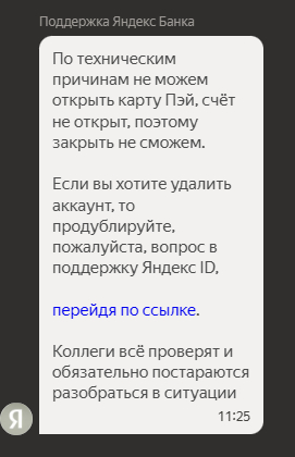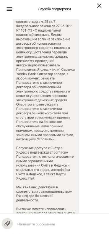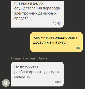 Думая, что теперь-то мне дверь открыта на сервис Я Пэй, обращаюсь в поддержку, объясняю, чего хочу, на что получаю недвусмысленный шаблонный ответ, который вкратце означает "отъебитесь". Мало того, закрыть счёт, чтобы я зарегистрировал новый на новый номер телефона контора тоже не может, потому что счёта нет. Но он заблокирован. Че?