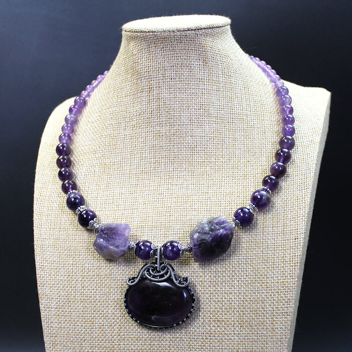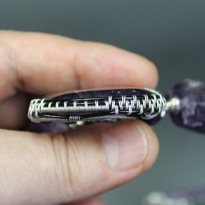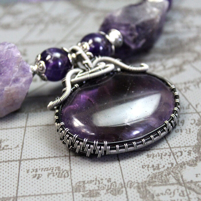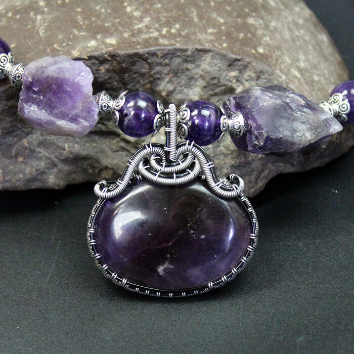 Авторское ожерелье с кулоном из проволоки и кабошона из камня аметист. Полированные бусины разного размера из натурального аметиста и два больших необработанных, природных камня из аметиста собраны на проволоку с памятью. Вся фурнитура цвета серебра.