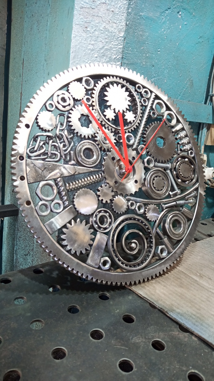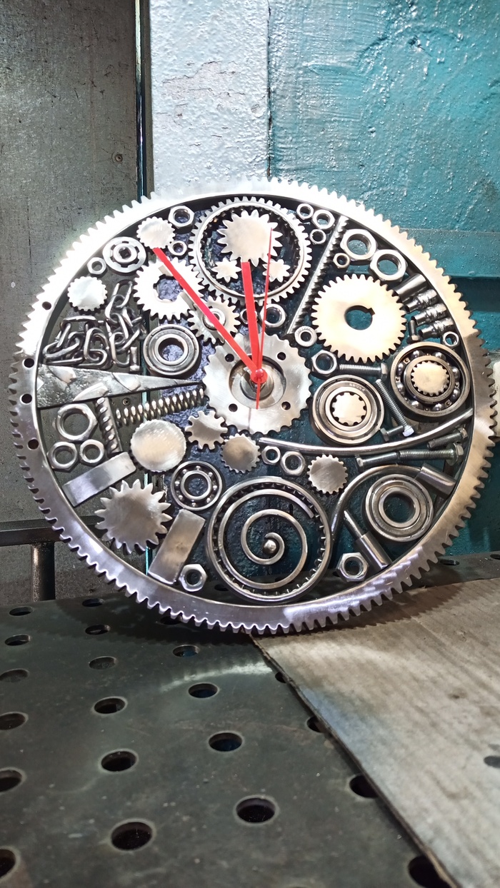 Потом, уже в процессе, пришло понимание, что нужна какая-то структурная основа и хаотичное накидывание деталей желаемого результата может не дать очень долго. Выбрал центральный элемент - какая-то звездочка типа велосипедной, затем элементы, обозначающие часовые метки. Эти метки и секторы между ними, из-за разного типа используемого железа, получились не явными, а скорее угадываемыми, но при этом легко читаемыми при беглом взгляде.
