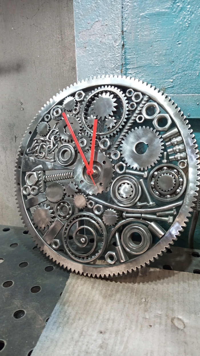 Основные элементы корпуса часов - зубчатый венец маховика D344 мм, различные шестерёнки из разобранной МКПП и какого-то редуктора, подшипники, метизы и прочая мелочёвка.