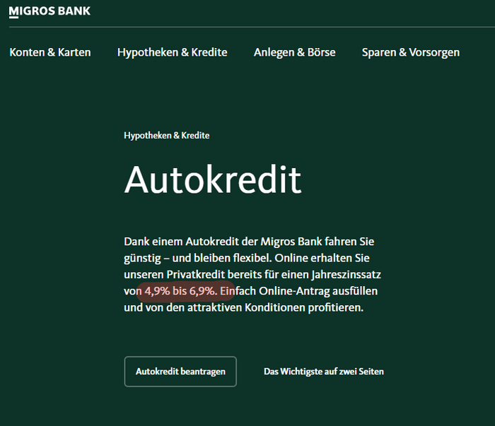 Совсем не обязательно оформлять кредит / лизинг прямо в салоне / непосредственно в финансовой структуре автопроизводителя. Никто не мешает взять приватный или автокредит в банке, но процентная ставка там, зачастую, выше. Т.е. глобально условия финансирования в кредитном институте автопроизводителя не редко бывают лучше, чем в обычном банке или сторонней кредитной организации (для сравнения процентная ставка банка Migros и сайта credit-now.ch):