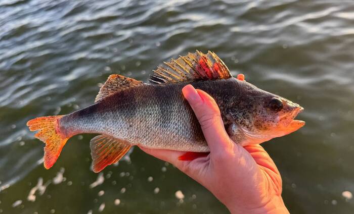 Надежды были большие, была солнечная погода и ветерок, но клёва не было. Спустя несколько часов удалось таки вымучить одного конопатого окуня.