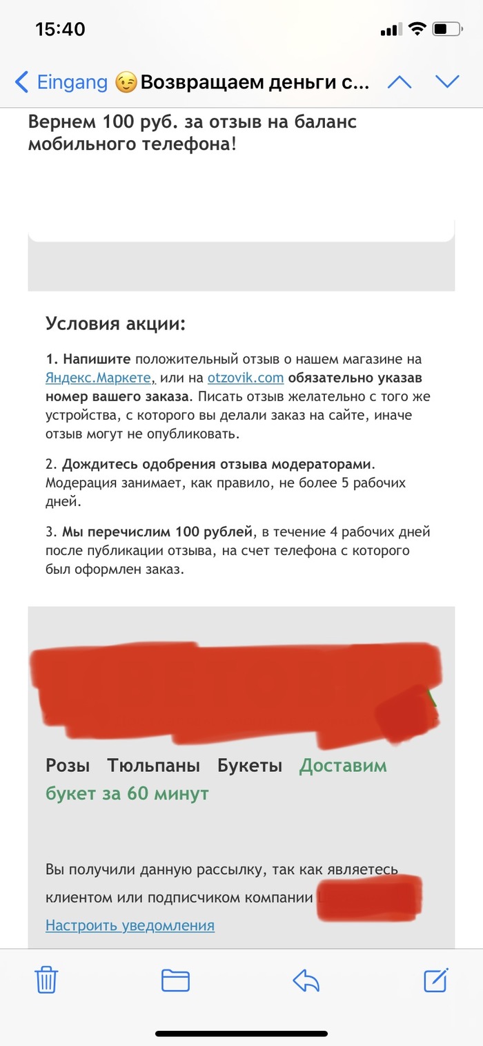 К дню рождения делала маме заказ цветов на российском сайте. После мне на почту приходит письмо.