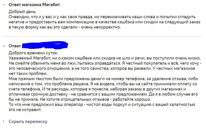 Соответственно, ребята получили "от ворот поворот". После этой неудачи на телефон супруги от них прилетело еще несколько звонков, на которые желания отвечать никакого не было уже и их номер был успешно отправлен в черный список. Далее последовало вышеуказанное обновление отзыва на Я.Маркете. Ответ Мегабита не заставил себя ждать.