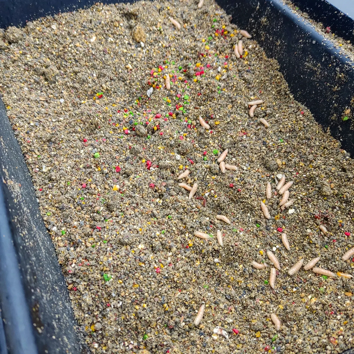 Из добавок использовал сироп "Сливки", т.к. хотелось сделать прикормку сладкой (очень теплая вода) и более липкой и инертной. А также красное пшено в качестве крупной фракции, которое очень красиво, создавая яркий контраст, выделялось в прикормочной смеси.