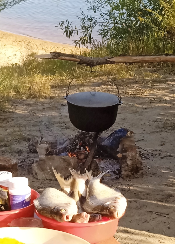 Андрей очистил несколько рыбёшек, Таня - картошку, морковку и лук, я налила воды в котелок и поставила на огонь. Мы начали варить Уху)