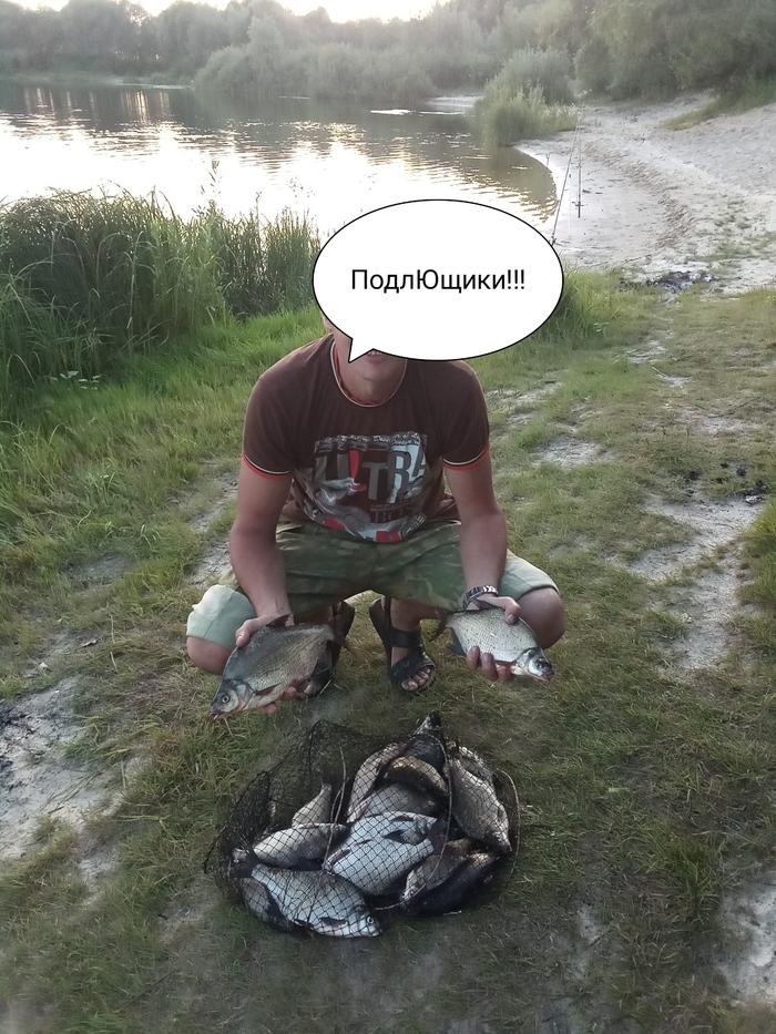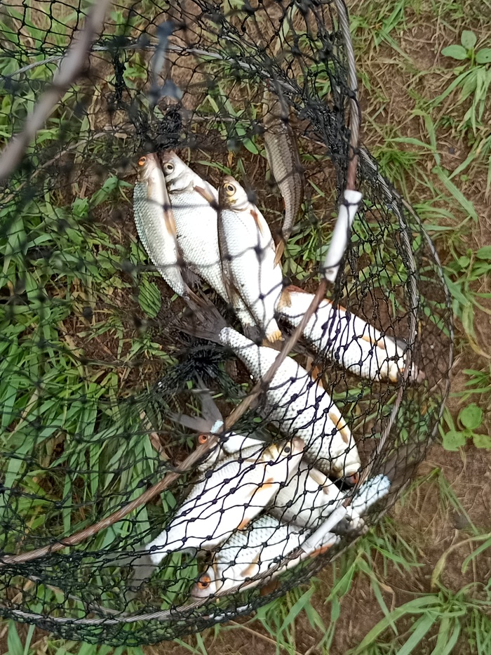 Поужинав, мы все вышли на берег, помогать Андрею сражаться с нападением подлещиков - его два фидера стояли, видимо, ну уж в очень хорошем месте. На Димины, стоя́щие чуть правее, тоже клевало, но гораздо реже. В небольших промежутках между поклёвками Андрей решил почистить уже пойманных рыбёшек. Подготовив пакеты, нож, ещё один стул и раскрыв садок, он уселся левее фидеров, в то время, как Таня ходила с телефоном и снимала красивые закаты, Дима перебрасывал свои удочки, а я смотрела за Андреевыми. Поклёвка. Я сняла колокольчик, чтобы не звенел, подсекла и вытянула подлещика в подсак, который принесла Таня (после предыдущей поклёвки он был возле Димы - подсак у нас один)).
