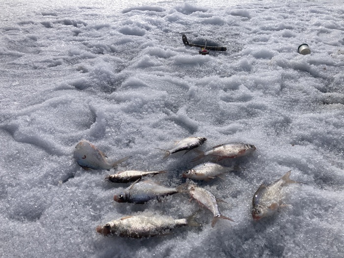 По итогу поймал около десятка рыбёшек. Плюс был срез - скорее всего щука балуется и ещё один кто-то немаленький отклеился по дороге на поверхность.