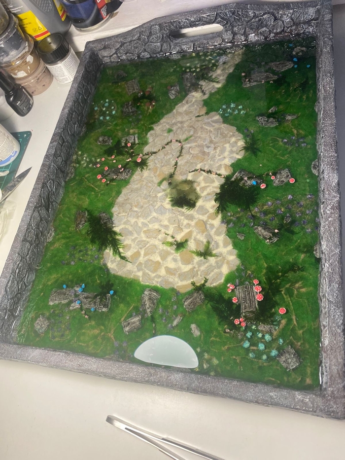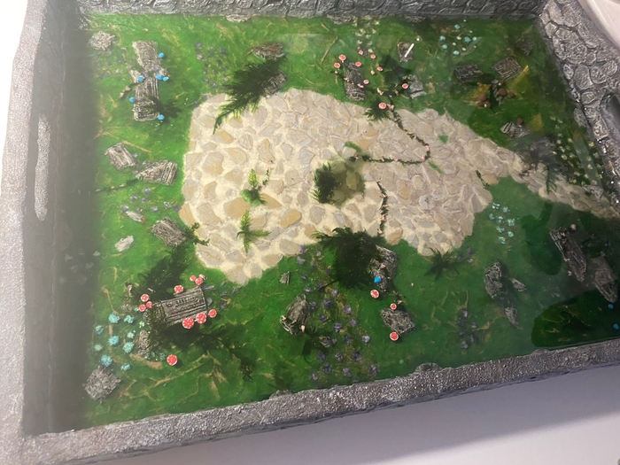 Начало серии «объемных» подносов. На данном этапе проработаны бортики подноса, сделана имитация каменных стен, разрушенных колонн во «дворе» замка.