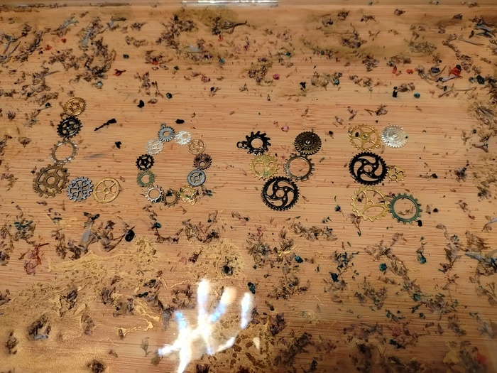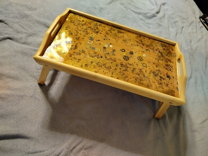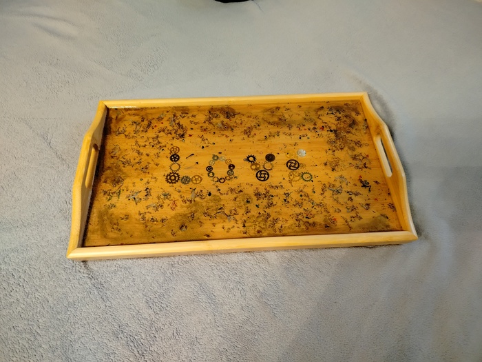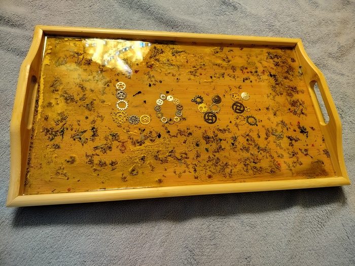 Внутри сухоцветы, декоративные шестерёнки, и для красоты добавлены золотые спиртовые чернила, ну и конечно, эпоксидка. Сам поднос куплен на авито.