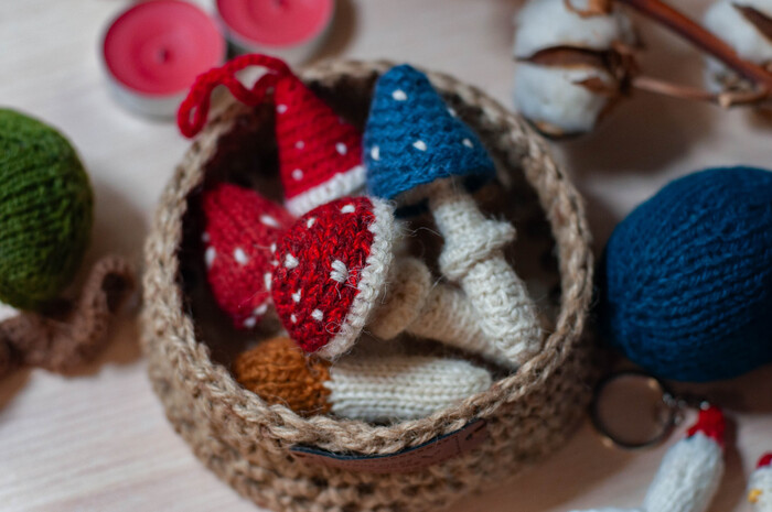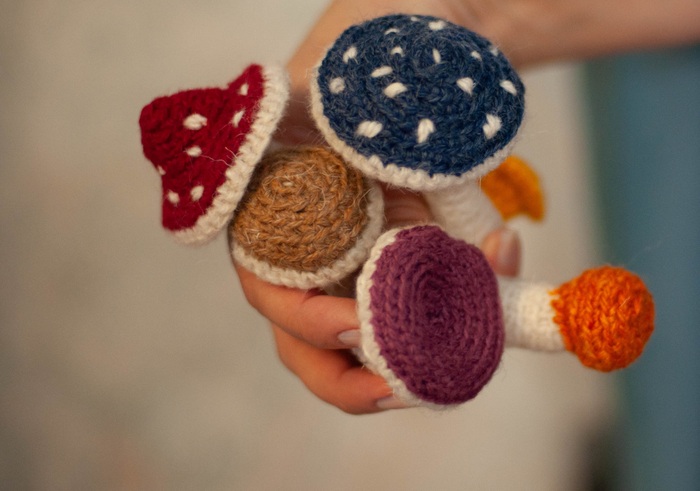 Вяжу и спицами, и крючком. Как-то так повелось, что нравятся оба вида вязания и стиль грибов, которые получаются. В работе натуральная шерсть. Наполнитель синтепон или холофайбер. Размеры от 6-10 см. Но могут быть и больше 😉