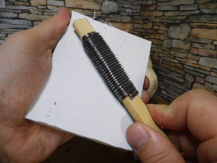 Пытаемся выгрызть это всё на наждачном барабане, заполним ортопедической микропористой резиной. Нам нужна плоская подошва. Будем ставить плотную резину, которой могут не понравиться такие вольности в виде изгибов. В последнее время мне очень понравилось царапать поверхность этим инструментом. Что-то типа рашпиля, только острее. Егоза на деревяшке, бля.
