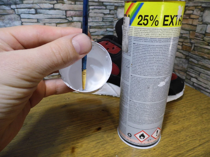 А пяточную часть и эту непонятную ребристость красим кисточкой. Как получить из баллона жидкую краску? Отвернув лицо пшикнуть в упор в колпачок из баллона.