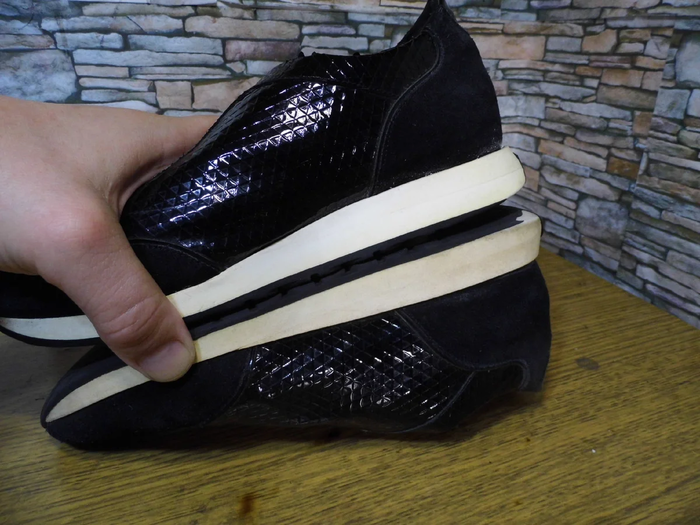 Умная фототехника ловит баланс белого, но подошва слегка желтовата. Чуть далее увидим разницу. Также есть небольшие выхваты на лаковой части верха. И замша уже немного поистрепалась.