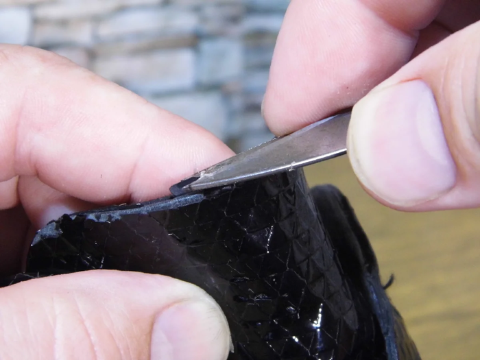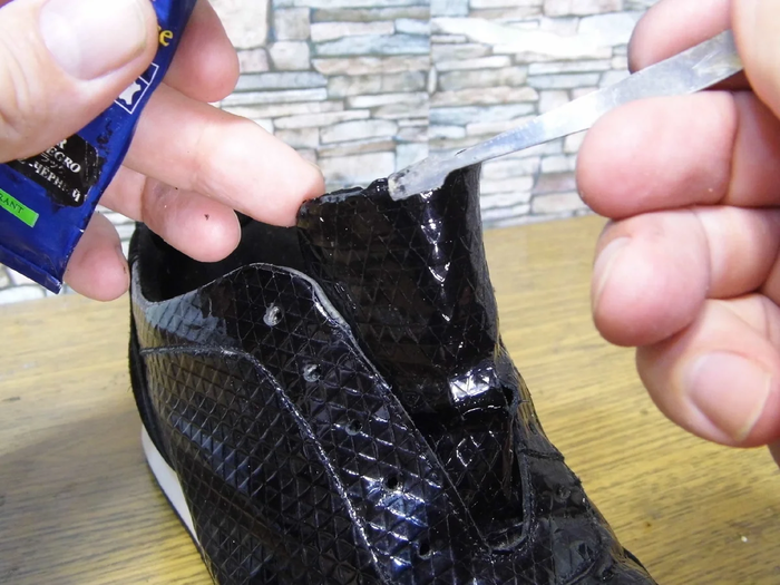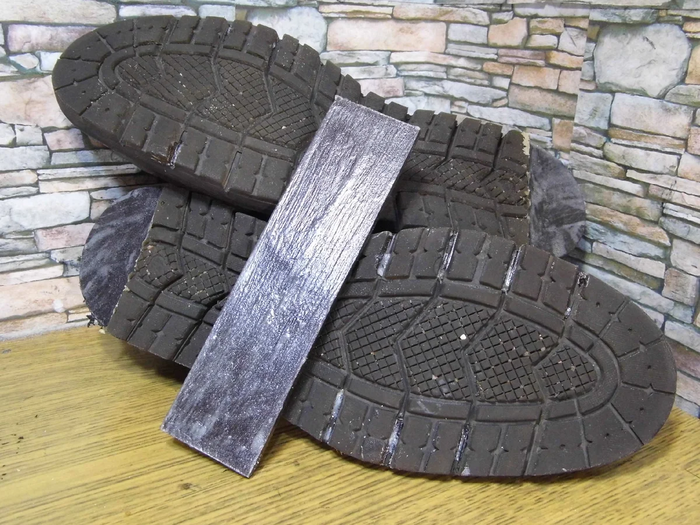Обратите внимание на нити в подошве. Это наподобие как в транспортёрной ленте. Мы их трогать не будем - полезная деталь. Вот подошва после двух слоёв клея. Видим ярко выраженную клеевую плёнку.
